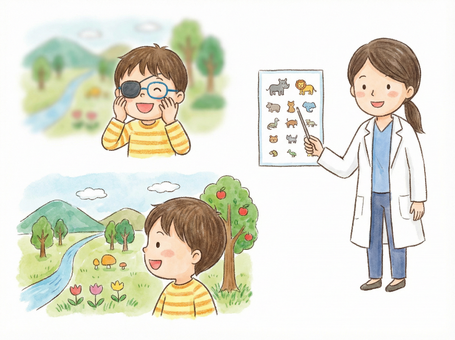 斜視があると、目線が外れている方の眼の視力発達が障害されます。見た目に分かりやすい斜視もあれば、一見わからない程度の斜視が隠れていることもあります。片目の視力発達は問題なく、3歳時検診や就学時検診などで指摘されることが多いです。 治療はまず視力発達が優先で、”健眼遮蔽”といって見ている方の眼を眼帯などで隠し、見えづらい方の眼で生活することで、弱視眼の成長を促します。同時にご本人の眼にあった眼鏡の装用も必要です。最初は1日3時間程度を目標に頑張ってもらいますが、子供はどうしても嫌がることも多く、眼帯を外してしまったり、ズルをして眼帯の隙間から見やすい方の眼で見ようとしたりします。そこはご両親やご親族など、皆さんで協力しながら、最初はできなくても徐々に頑張れるよう、励ましながら続けていくことが大切です。無事に視力が十分に発達したら、斜視手術をお勧めすることがあります。