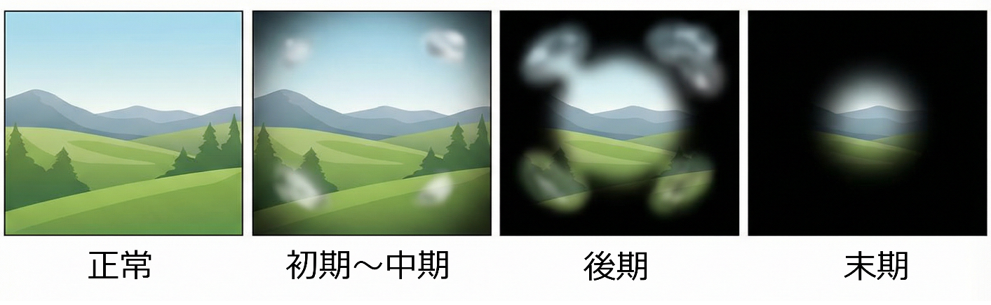 初期は無症状で経過することが多いです。逆に言うと「見えづらい」「視野が欠けている気がする」といった症状を自覚するころには、相当に進行した緑内障であると考えられます。近視の強い方の緑内障は、中心部に近いところの視野欠損が現れやすいという特徴もあります。 残念ながら失った視野を取り戻すことはできず、いずれは失明に至る場合も多く、常に眼科の失明の原因の上位に挙げられます。
