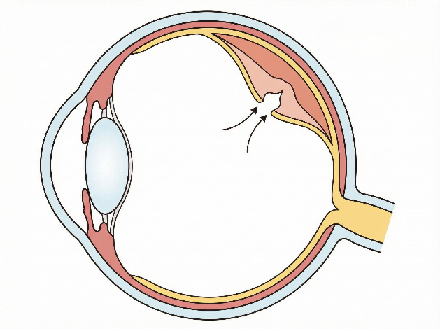 網膜裂孔は、眼の奥にある神経の膜である網膜に小さな裂け目ができる病気です。原因は眼内の硝子体の変化(後部硝子体剥離:別項参照)がメインで、硝子体が網膜を引っ張ることで裂孔を形成することがあります。ほか外傷による衝撃で硝子体が揺さぶられることでも形成されます。近視の方は網膜が薄くなっており裂孔を発症しやすいです。網膜裂孔が原因で網膜剥離を起こすことが多く、早期発見・早期治療が望ましい病気です。