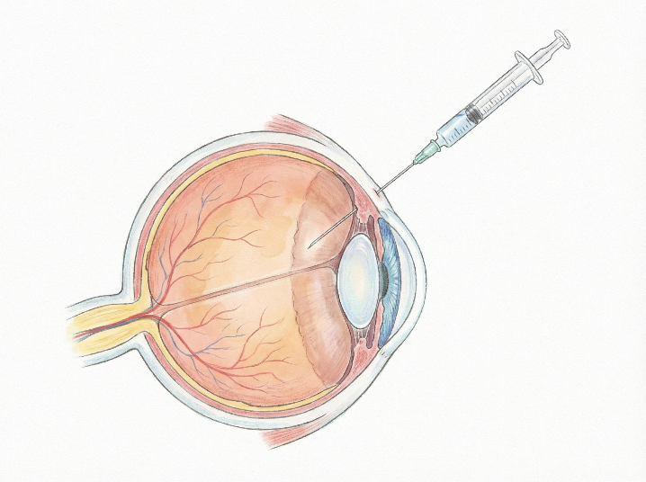 滲出型加齢黄斑変性に対しては、抗VEGF薬硝子体内注射が第一選択になります。注射がメインの治療になりますが、完治するわけではなく、あくまで病気の活動性を抑えること、現状維持が目標になります。見え方としても見えづらさや歪みといった症状が消失することはなく、生涯にわたってお付き合いが必要な病気です。詳しくはこちら「硝子体内注射」についてをご参照ください。