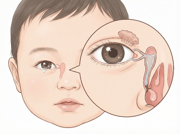 涙は涙腺から出た後、目頭にある涙小管(涙の排水溝)から吸収され、鼻の奥に排出されます。生後間もない時期には、この涙道が未発達で、鼻の奥の涙道の一部が閉塞していることがあります。このようなお子さんは、涙目や流涙(泣いていないのに涙がポロポロ流れてくる)、起きたときに目じりにメヤニが多いなどの症状が出ることが多いです。同様の症状で結膜炎などもあり、症状だけで診断することはできません。治療について、多くは涙嚢マッサージといって鼻の付け根あたりをマッサージすることで改善しますが、数か月行っても改善しない場合には、涙道ブジーなどの処置が必要になります。