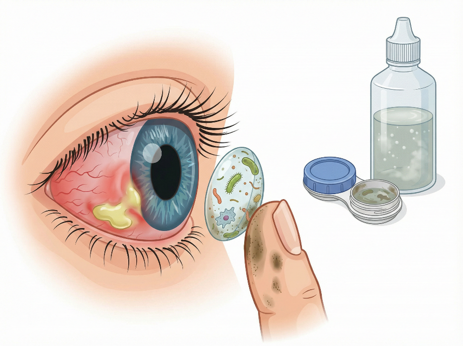 コンタクトレンズは直接的に目に装用するもので、眼にとっては異物であり、プラスに働くことは非常に少ないです。 よく知られたトラブルとしては、ドライアイなどのほか、細菌感染や角膜の傷、また角膜への酸素供給量の減少と結膜血管侵入および角膜混濁、角膜内皮細胞障害などが挙げられます。 コンタクトレンズにも種類がありますが、最もトラブルが多いのは2weekタイプのソフトコンタクトレンズです。その理由として、消毒の不備や洗浄液・保存液のトラブル、また装用期間を守らずに長期使用するケースが多いことなどが指摘されています。