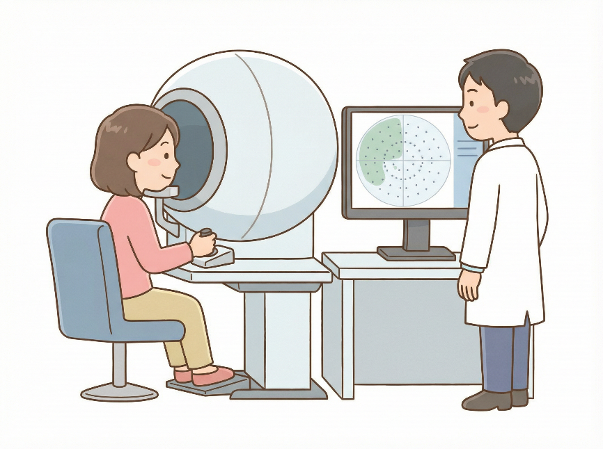 視力検査や眼圧検査のほか、眼底検査で視神経乳頭を観察したり、OCTという器械で視神経につながる神経線維の層の厚さを計測して緑内障を疑うこともあります。緑内障を疑われたら、次に行うのが視野検査で、実際にどこか見えていない場所がないかを検査します。また緑内障の進行の判定にも視野検査が主に用いられ、継続的に検査をすることで進行・悪化のスピードを評価する必要があります。 当院では一般的なハンフリー視野計(器械による視野測定)やゴールドマン視野計(スタッフが行う視野測定)のほか、最新のアイモVifaという視野計を導入し、両眼開放で検査時間をより短縮することで患者さんの負担を減らしながらも、高精度な評価が可能となっております。
