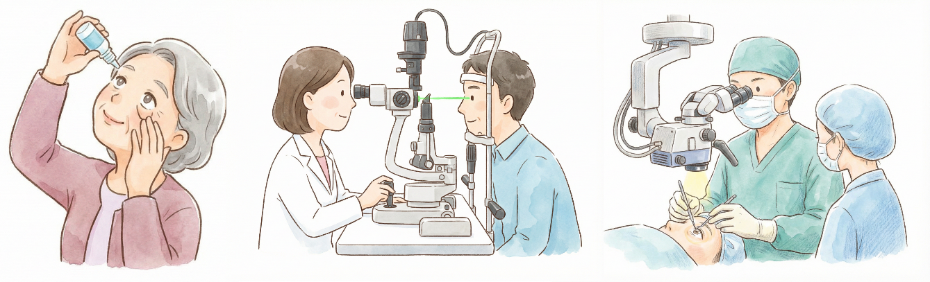 視野欠損を回復させることはできず、できるだけ進行を遅らせることが治療の目的になります。 医学的な唯一の治療法は「眼圧を下げること」です。眼圧は”眼の硬さ”であり、正常範囲は10~21mmHgとされていますが、ちょうど良い眼圧は患者さんごとで異なり、少しくらい高くても問題ない方もいれば、14mmHgでも進行が早い方もいて、日本人の70%以上は眼圧が正常な緑内障(正常眼圧緑内障)ということが知られています。 具体的な治療法として、日本ではまず点眼治療が主に行われます。それでも眼圧管理が不十分な場合や視野異常が進行する場合に、SLTレーザー治療や手術などが検討となります。海外では点眼の前にSLTレーザー治療や手術が行われることも多く、日本でもレーザーで治療を開始する方も増えています。 当院ではSLTレーザーはもちろん、手術治療についてもいろいろご相談ができます(院長の専門分野の一つです)。詳しくはこちら「レーザー治療(緑内障)」 「緑内障手術」 をご参照ください。
