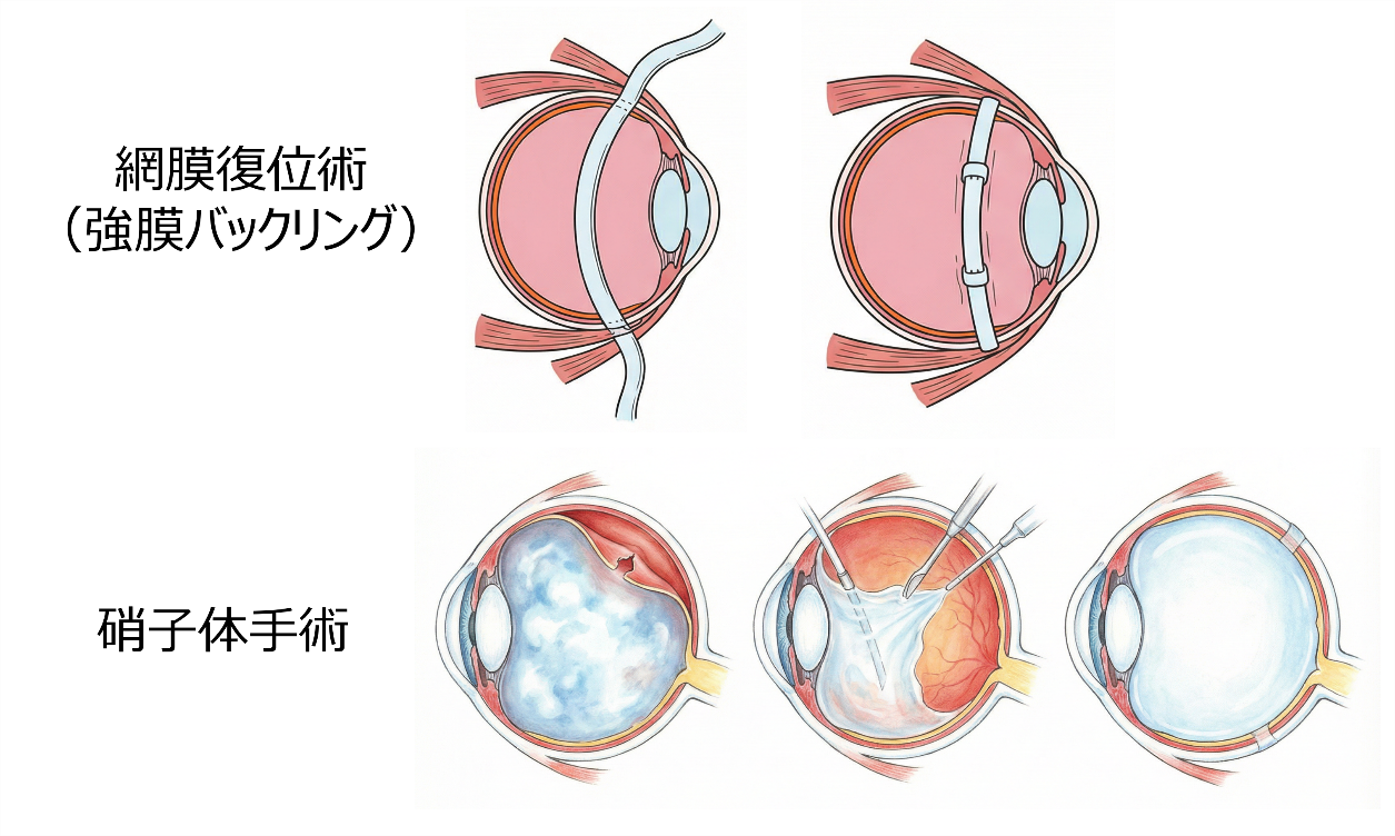 基本的に手術治療が必要です。眼の中の状況によって、網膜復位術(強膜バックリング)や硝子体手術が行われ、また網膜剥離の状態次第では両方を行うこともあります。網膜復位術は網膜裂孔に相当する部分に冷凍凝固を行って剥がれにくくし、さらに眼の外側からあて物をして硝子体の牽引を和らげることで網膜の復位を目指します。比較的若年の方の網膜剥離はこの方法を選択されることもあります。硝子体手術では網膜を牽引する硝子体そのものを手術で取り除き、眼の中から空気を入れて膨らませることで網膜を基の位置に戻し、レーザー治療などで裂孔の周囲を固めてくる方法です。どんな網膜剥離にも適応のある手術であり、現在の主流の方法と言えます。ただ術後にレーザーののり付けが固まるまでの間、すぐに剥離してこないように、眼の中に空気や特殊なガス、またシリコーンオイルといった物質を眼内に注入して手術を終えます。オイルやガスによって裂孔周囲や黄斑部付近をしっかり支えてくれる必要があり、1週間から10日間前後(場合により異なります)、うつ伏せや下向き、横向きなど姿勢の体位制限が必要になります。姿勢はその時々で変わるので、術後の指示に従ってください。