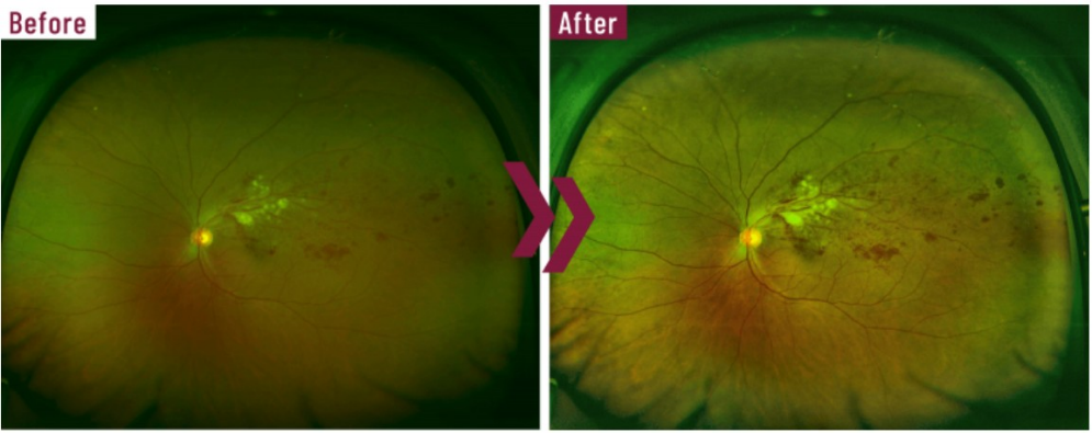 画像鮮明化ソフトのMier(ミエル)は、眼底写真など眼科の検査で得られた画像を独自に処理することで、画質を向上させ、より病変などを確認しやすくするソフトウェアです。特に広角眼底カメラとの相性がとてもいいことが知られており、従来の検査では見逃しがちであった小さな病変などの早期診断につながることが大いに期待されます。日本が世界に誇る技術の一つです。 当院でも同ソフトを導入し、病変の見逃しなどを極めて最小限にすることで、皆さんの眼の健康をより高いレベルで守っていけるように努めております。