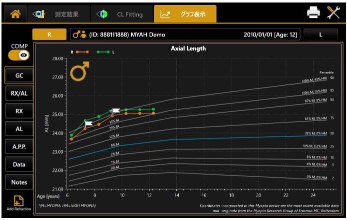 MYAHは眼軸長測定検査や角膜形状解析、ドライアイ診断など多くの機能を併せ持つ機器です。特に子供の近視治療において、短時間で眼軸長測定や角膜形状解析が可能であり、眼軸長の進展をモニタリングすることで近視進行の程度を時系列にしてグラフ化します。さらにアジア人のデータを基に作成された成長曲線との比較を行うことで、進行速度についてもより的確に評価し、皆さんに現状を可視化してお伝えすることが可能となりました。 当院ではこのMYAHを北海道初導入しました。子供たちの近視について評価するとともに、治療も含めて眼のことについて皆さんにご興味を持ってもらえるよう、また治療の効果などについても的確に状況をお伝えしながら相談できるよう、体制を整えております。