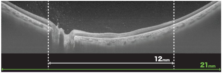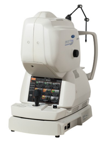 三次元画像解析装置(OCT)は現代の眼科に必要不可欠な機器の一つで、主に網膜の層構造を詳細に可視化することで、多くの網膜病変の発見や評価、また治療効果の判定などが的確に行えるようになりました。また視神経乳頭周囲の神経線維の厚さを解析することで緑内障の評価が可能となったり、Angiographyといって網膜血管や脈絡膜血管の血流を造影剤を用いることなく評価することができ、低侵襲で眼底の状態を把握することができるようになりました。 Triton Plus ProはTopcon社が提供する最新鋭のOCTで、眼科臨床で必要とされるすべての機能を高いレベルで可視化することができ、従来機器では評価が難しかった硝子体や網膜、脈絡膜までも鮮明に描写されるようになりました。