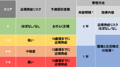 同じ生活をしていても、強い近視になる子もいれば、そうでもない子もいますよね。ここでは近視発症のリスク評価について、ひとつご紹介させていただきます。 北アイルランドの疫学研究調査に基づいて作成され、現在は広く使われるようになったリスク指標にPreMo(Predicting Myopia Onset and Progression)というのがあります。簡単に3つの項目があり、1:両親が近視かどうか、2:近視の度数はどうか、3:眼軸長はどうかの3点です。子供の年齢によっても基準値は異なりますが、6~8歳での基準、9~10歳での基準をもとにスコアを算出したもののほか、近視発症前のスコアや、発症後のスコアについても提唱されています。近視は低年齢で発症するほど強度の近視に至る可能性が高まるため、ハイリスクと判断された子供たちには定期的な眼科検診と生活様式の改善が推奨されています。詳しくは 先端近視センターのホームページ(https://myopia-center.com/) をご参照ください。