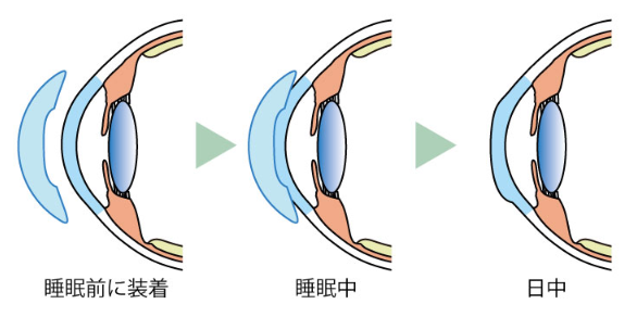 オルソケラトロジーはナイトコンタクトとも呼ばれ、特殊な形状のハードコンタクトレンズを就寝時に装用することで、角膜の形状を一定時間変形させ、日中に裸眼で過ごせるように矯正する治療です。もともとは軽度の近視の方を対象に使用されておりましたが、現在は近視進行抑制目的に行われることが増えております。当院ではいずれの目的においても処方可能です。 メリットは日中は主に裸眼で生活ができること、装用をやめたら角膜形状が元に戻る点が安心できると言えます。また夜間に装用するので両親が管理しやすい点も大きいです。低濃度アトロピン点眼治療との併用も可能です。レンズは厚生労働省とアメリカFDAで認可された高酸素透過性コンタクトレンズを使用します。当院ではブレスオーコレクトを採用しております。 デメリットとしては、毎日のレンズケアが必須である点、朝は調子が良くても夕方には角膜形状が元に戻ってくるため一日の中で見え方に変動があること、コンタクトレンズ一般のリスク(感染症やドライアイ、アレルギー、眼瞼下垂、角膜内皮障害など)は避けられず、これらの治療が保険適応外となり自費診療となること、レンズが高価なため紛失や破損の際には大きな費用がかかることなどです。またハードコンタクトレンズなので、どうしても異物感は出てしまいますので、特に治療初期には気になるかもしれません。そして治療を途中でやめてしまうとリバウンドが起こりやすいことも知られており、少なくとも18歳以上まで継続使用が望ましいです。また適応症例が限られ、全員が行うことはできません。